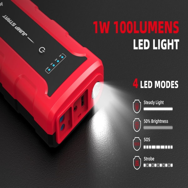 4.LED Flex-light - The jump starter battery pack is equipped with 4 modes of LED light(Steady Light/ 50% Bright Steady Light/ Flash/ S.O.S).